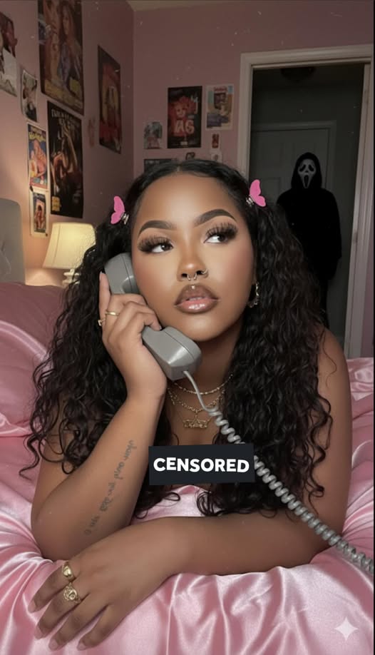 Prompt: "Create a photo of me in a dreamy y2k style portrait of me laying on a shiny pink satin bedding as i hold a large 90s style chorded phone and in a thoughtful daydreaming pose her long black hair falls freely in loose curls with pink clips on each side. she wears delicate jewelry including dainty gold necklaces and accessories and gold chunky rings. the room behind her is girly and daydreamy with 90s posters. her makeup is simple yet glamorous with brown lipgloss and brown lip liner. the photo should have a grainy 90s style to it with a light source like a lamp in a dimly lit room at night. the ghostface killer should be behind her staring at her, his body should be dimly lit, and he should be standing in the doorway of a dimly hallway. the background behind he should be slightly dark and ominous."
