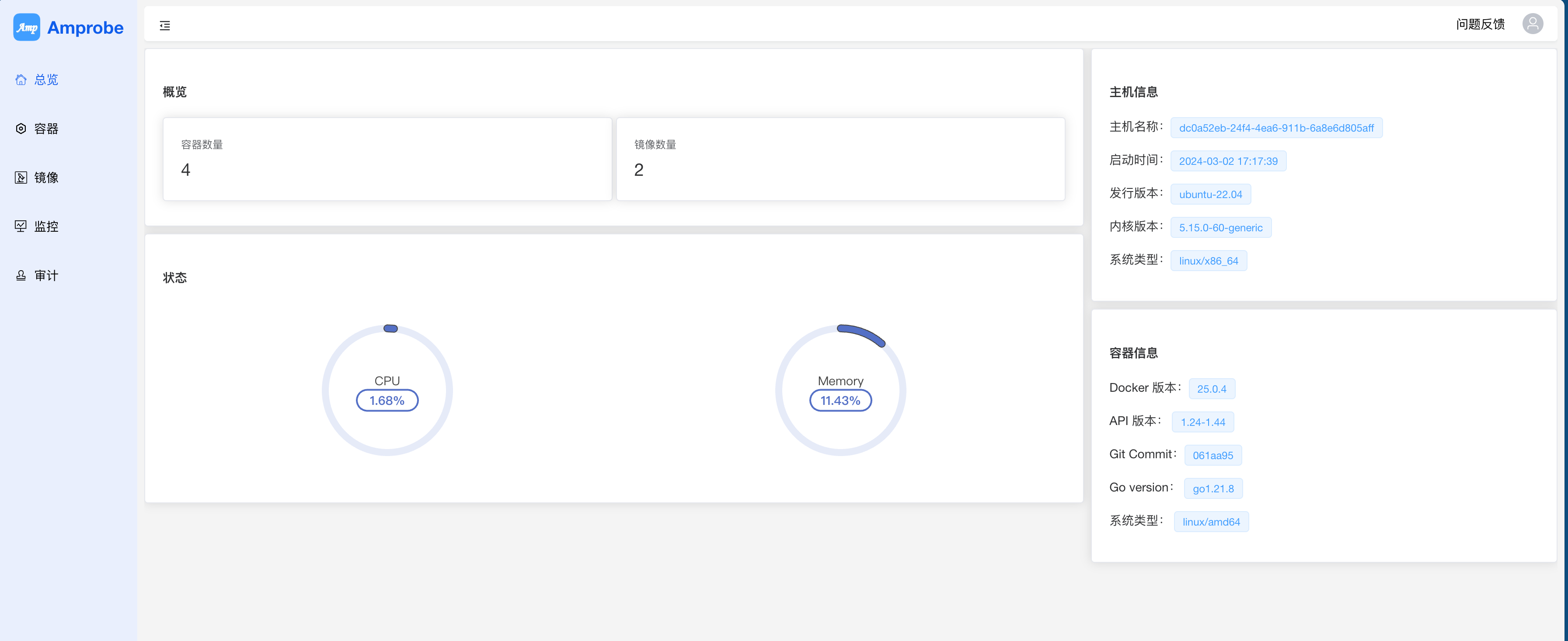 Amprobe 是一个基于 Go + Vue3 开发的轻量级主机及 Docker 容器监控工具,支持监控主机和容器的 CPU、内存、磁盘 IO、网络 IO 等状态,并提供日志查看、下载及简单的容器运维功能。