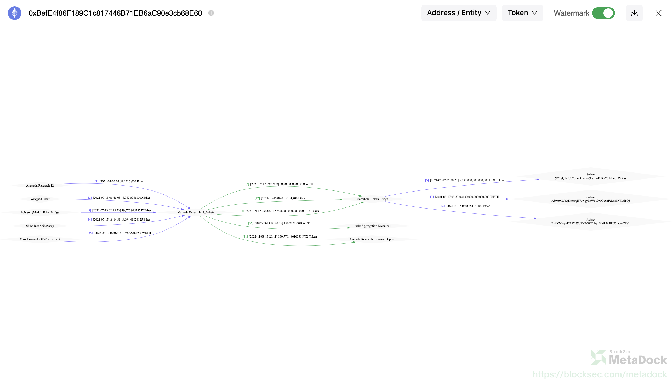 # 🔗链接官网:https://blocksec.com/metadock源码仓库:https://github.com/blocksecteam/metadock# 📜介绍1. 能在各区块链浏览器一键生成地址的资金流向图,支持跨链2. 提供地址标签增强和合规性评分;联动Denbanl、Tenderly等;展示合约创建资金来源;支持合约代码工程一键下载等3. 能在OpenSea绘制风险雷达图