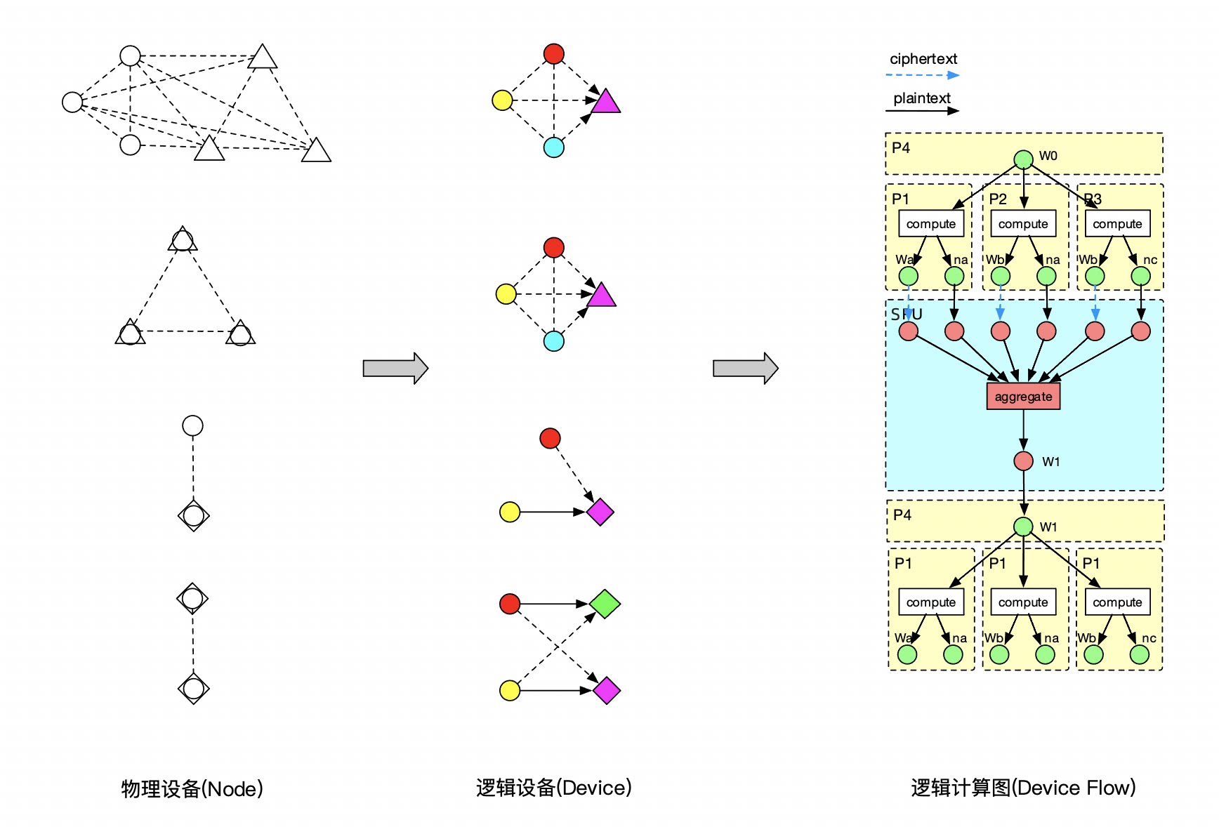 明密文混合调度层:提供了统一的设备调度抽象,将上层算法描述为一张有向无环图,其中节点表示某个设备上的计算,边表示设备之间的数据流动,即逻辑计算图。逻辑计算图由分布式框架进一步拆分并调度至物理节点。