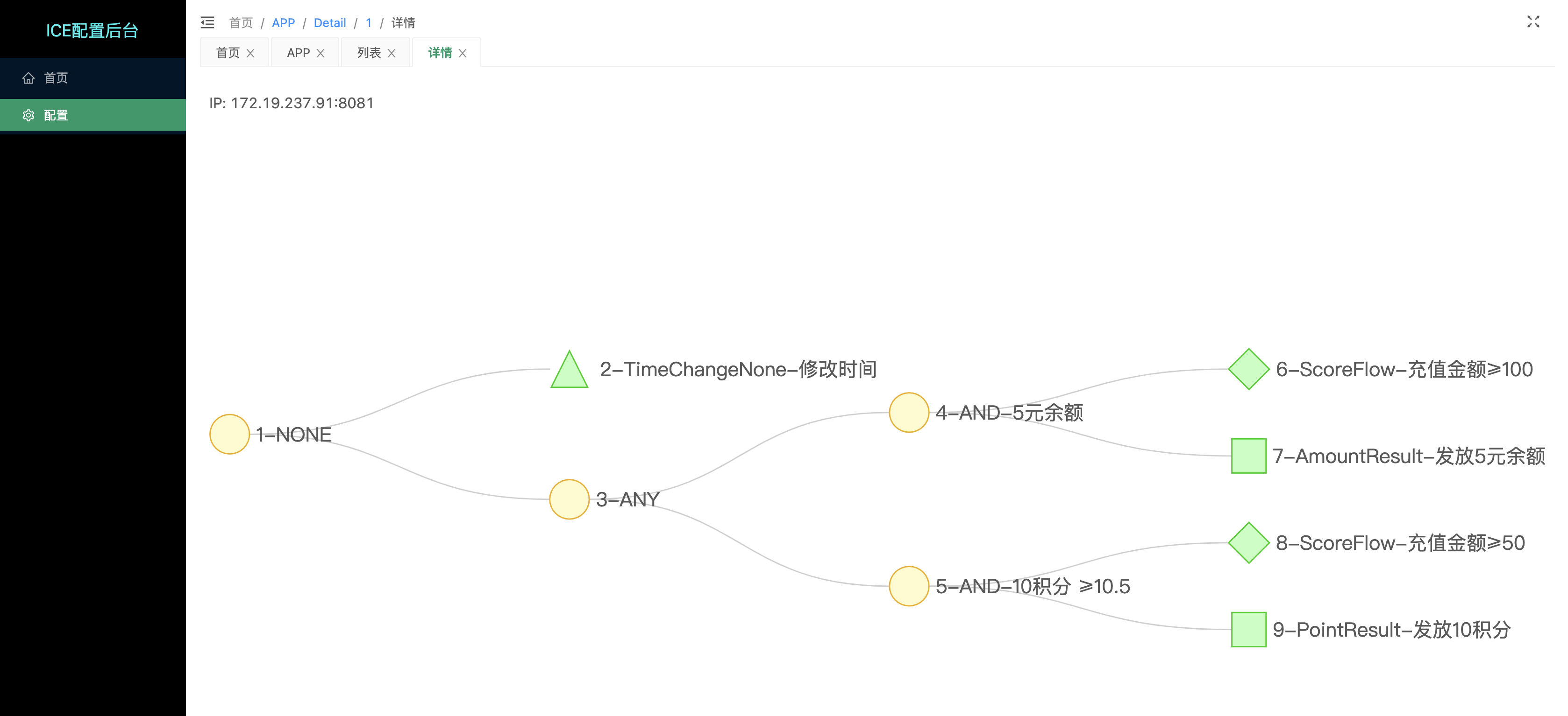 ice致力于解决灵活繁复的硬编码问题,如营销活动/风控/监控报警等场景,这些场景下规则/流程复杂度高,变更频繁。ice属于轻量级,热更新,高性能的规则引擎,并且提供了一整套后台配置页面。接入成本低,上手使用快。ice是我工作以来,业余时间一直在思考的一个项目,从最初的有想法到最终落地实践走过了5个年头,也经历了生产环境两年多的考验,在营销活动这个场景中表现出色(提升了一倍多的活动开发效率,降低了线上90%故障率,后期上线一个简单活动,从需求产出到上线完成不到1h,小活动直接运营配置,无需开发)。文档地址: http://waitmoon.com/docsice简介视频: https://b23.tv/cdCnB68ice后台配置简介视频: https://b23.tv/rk82So2配置体验地址: http://waitmoon.com/config (部署了一个ice-server实例 两个ice-test实例)github:https://github.com/zjn-zjn/ice附图:配置列表:配置详情: