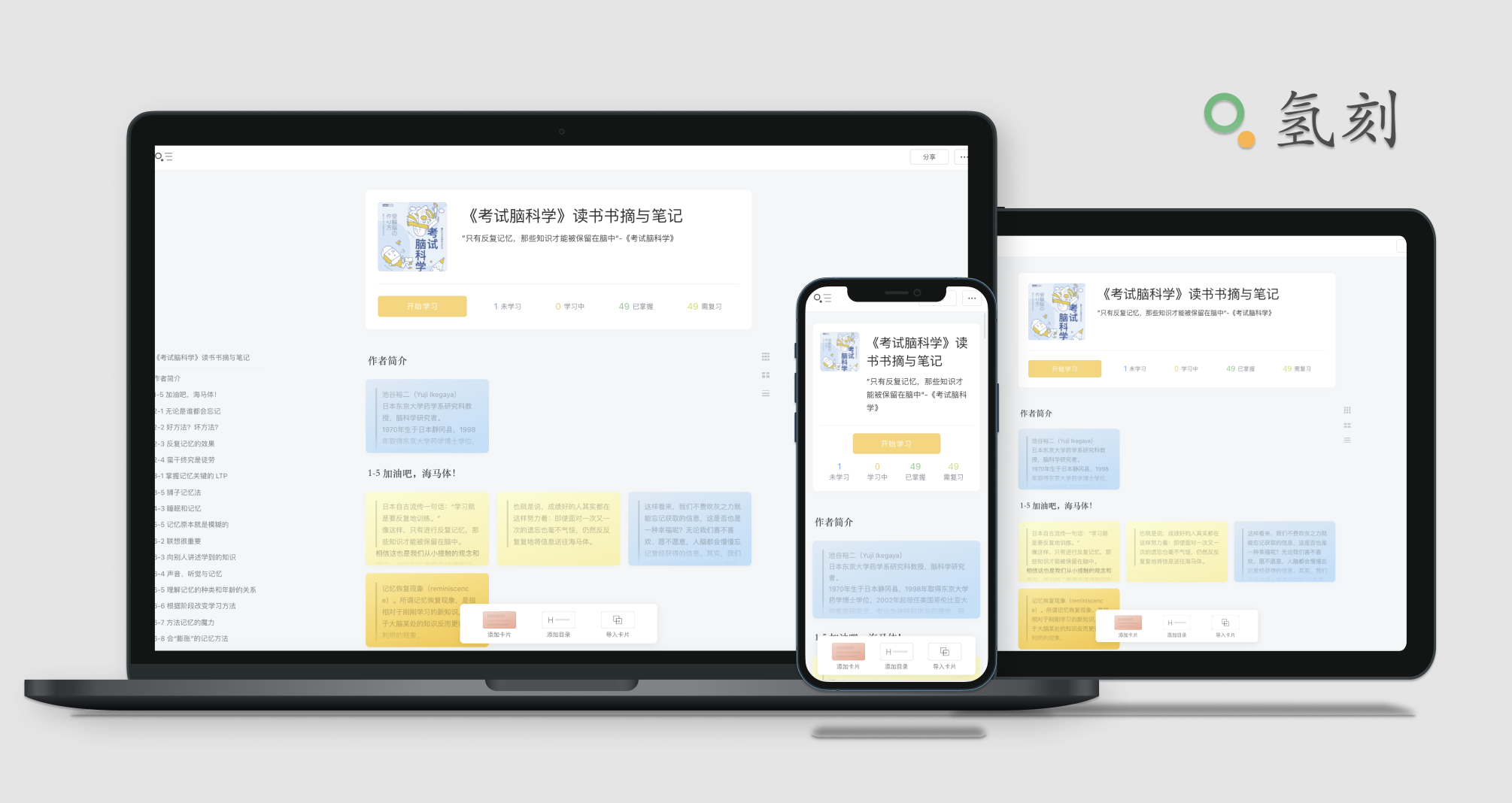 ### 开发背景:想要做一款可以记录知识点,同时还能复习知识点的工具,因为:“只有进行反复记忆,那些知识才能被保留在脑中” -《考试脑科学》,同时希望以卡片的形式出现,一个卡片就是一个知识点,并且不同的卡片主题可以集合起来,放在一个卡片盒,方便管理,再有就是希望PC端可以很方便的记录或导入笔记,移动端也可以方便随时复习,还有就是希望轻便、简洁、易用,所以开发了氢刻。### 氢刻简介:卡片笔记 + 复习回顾工具;具有记录、复习、快速提取信息等功能。官网地址:https://qingk.com ;App下载地址:https://qingk.com/downloads 。可以直接在PC端网页版开始记录与复习,也可以使用手机App随时随地复习重要知识点,还可以在氢刻微信公众号直接进入氢刻,目前氢刻已实现多端同步记录与复习。记录:记录内容:一张卡片可以是一段文字、一张图片、一段录音或者是一个标题对应一个内容格式的,支持常用的笔记编辑功能、文字高亮、波浪线等。比如:读书笔记类型:(支持导入微信读书笔记,快速开始复习重要书摘与笔记)