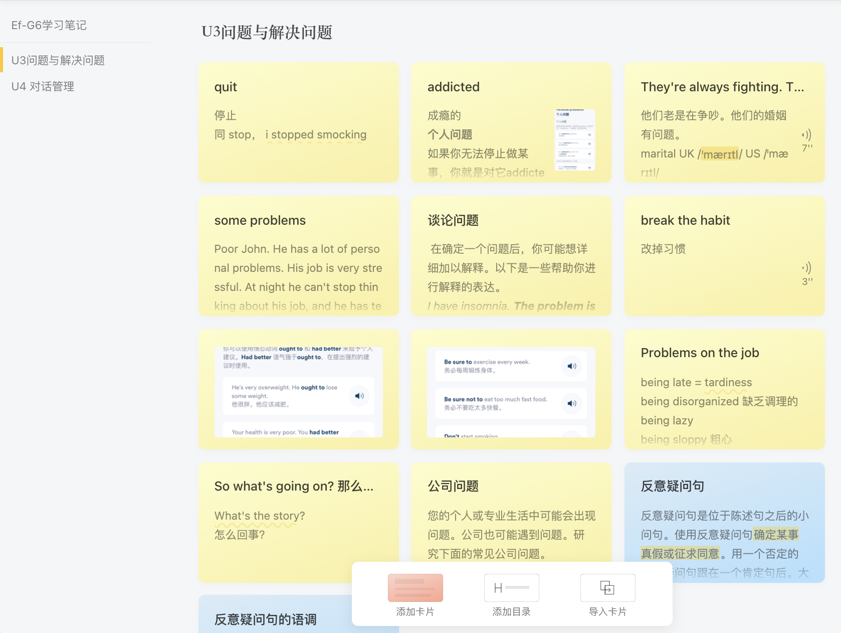 卡片盒支持添加目录、导入卡片笔记等功能。复习:复习功能:可以直接复习知识点,反复翻看重要笔记,也可以用强制回想的功能,首先出现标题,回想后再显示答案,两种模式;**