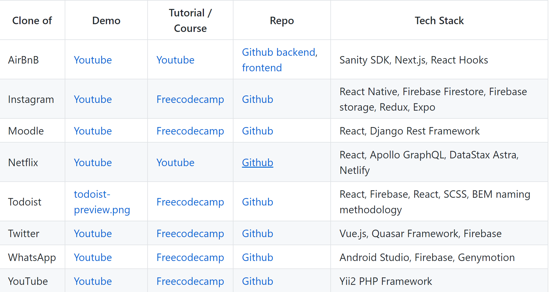 首先推荐个人github @mianshiba,技术,产品,搞钱三位一体,持续迭代中,欢迎关注star,一起学习。下面是整理的互联网大厂产品的开源克隆集合,真是难为他了,感谢。 **https://github.com/GorvGoyl/Clone-Wars#clones-with-tutorials**