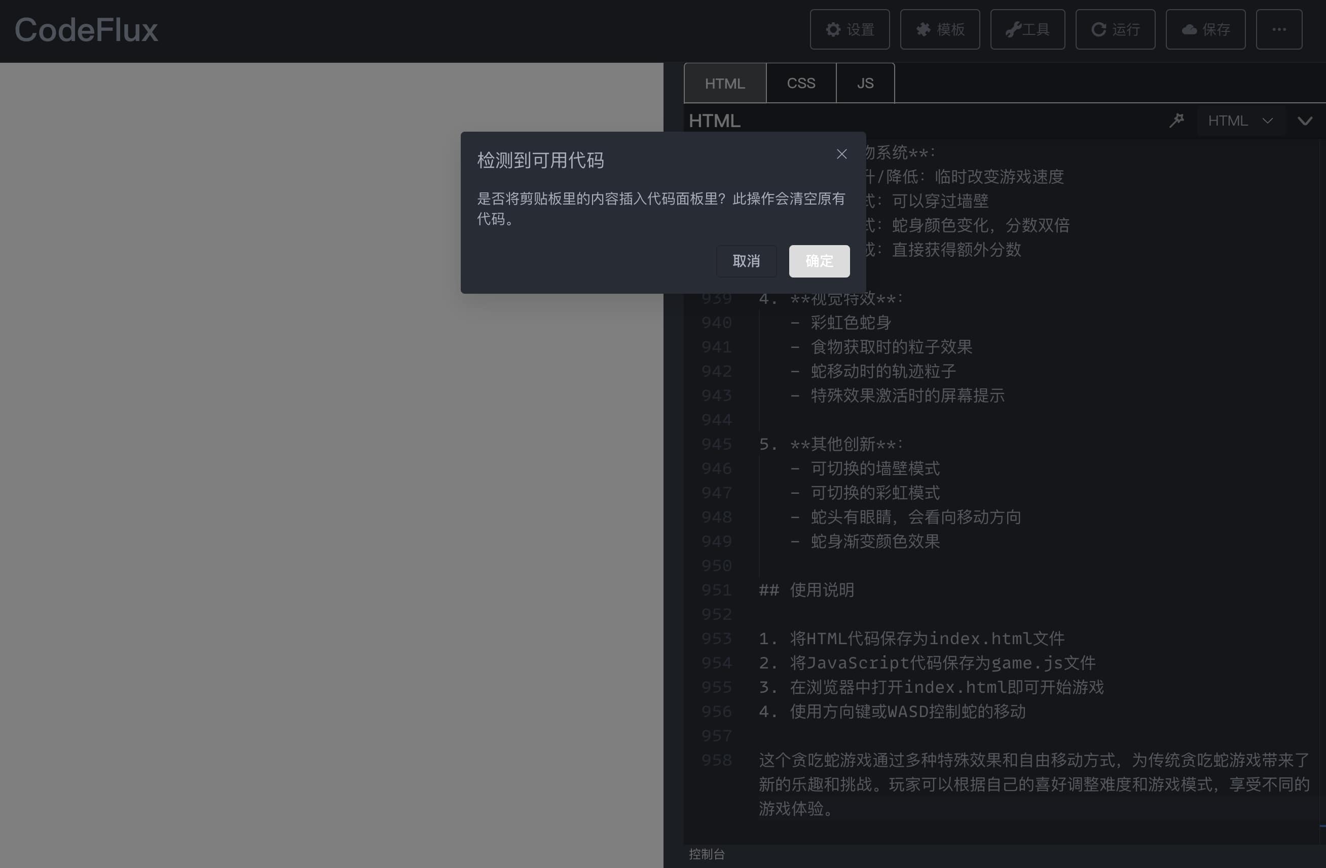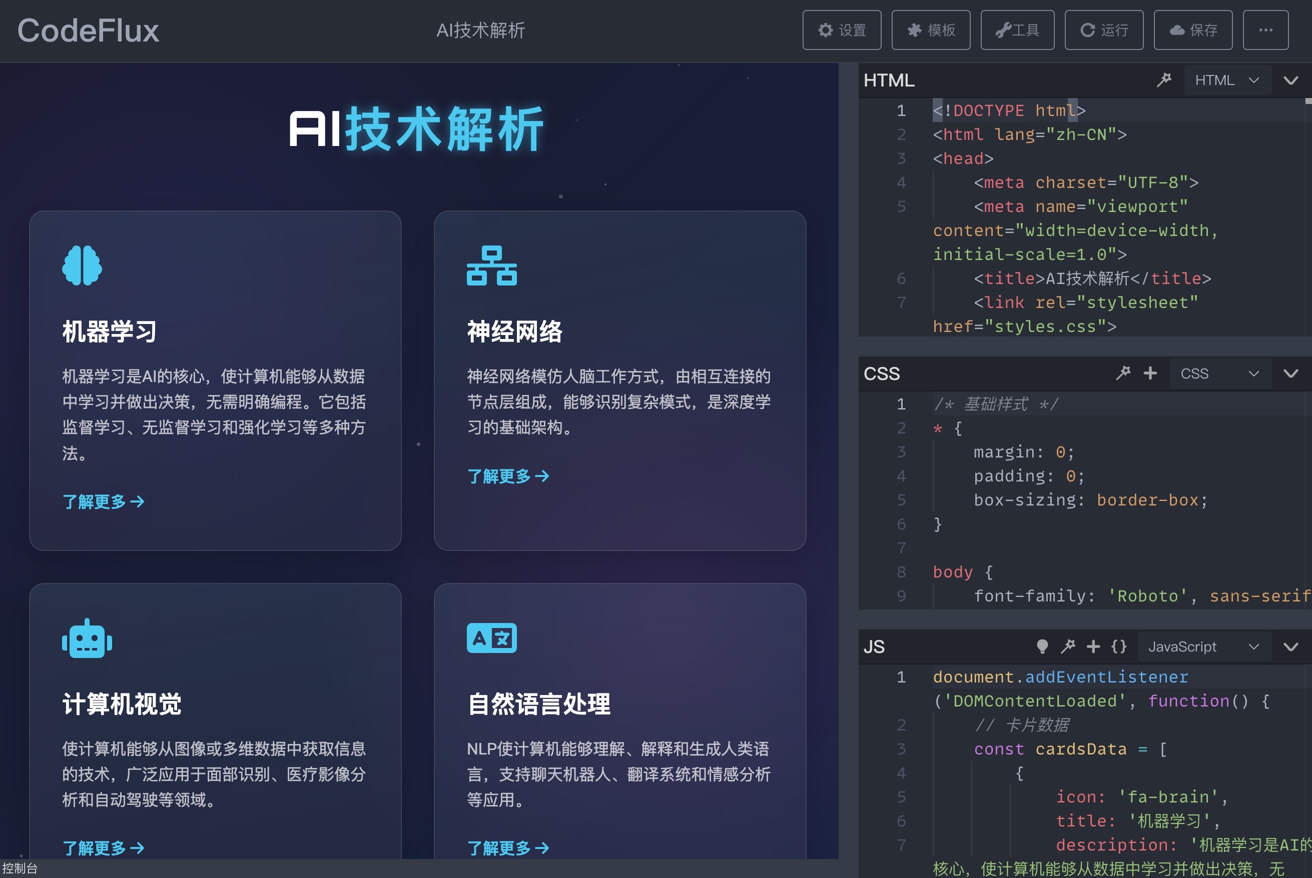 CodeFlux是一个开源的AI生成式前端代码预览和微调辅助工具,提供在线运行和发布平台,可作为CodePen、JSBin等工具的替代方案。支持快速预览和调试AI生成的前端代码,适用于网页开发、原型验证等场景。
